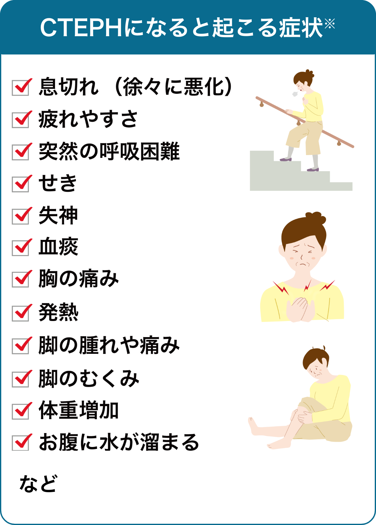 CTEPH[chronic thromboembolic pulmonary hypertension:慢性⾎栓塞栓性肺⾼⾎圧症(まんせいけっせんそくせんせいはいこうけつあつしょう)]は、特別な⾃覚症状はほとんどありません。肺や⼼臓への負担の⼤きさに伴い症状が重くなっていくので、症状を⾃覚したときには、病状が進⾏していることも少なくありません。