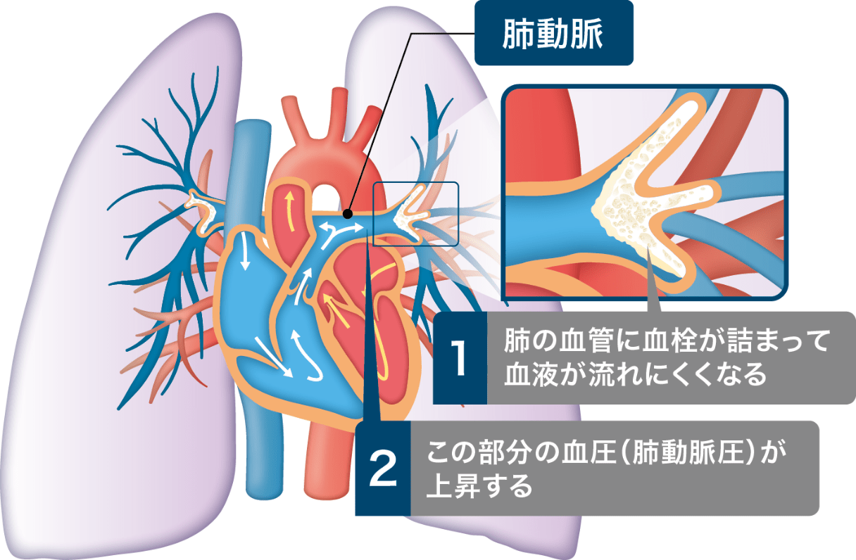 ②⼼臓から肺に⾎液を送り出す際に肺動脈にかかる圧[肺動脈圧(はいどうみゃくあつ)]が上昇し、CTEPH[chronic thromboembolic pulmonary hypertension:慢性⾎栓塞栓性肺⾼⾎圧症(まんせいけっせんそくせんせいはいこうけつあつしょう)]が起こります。